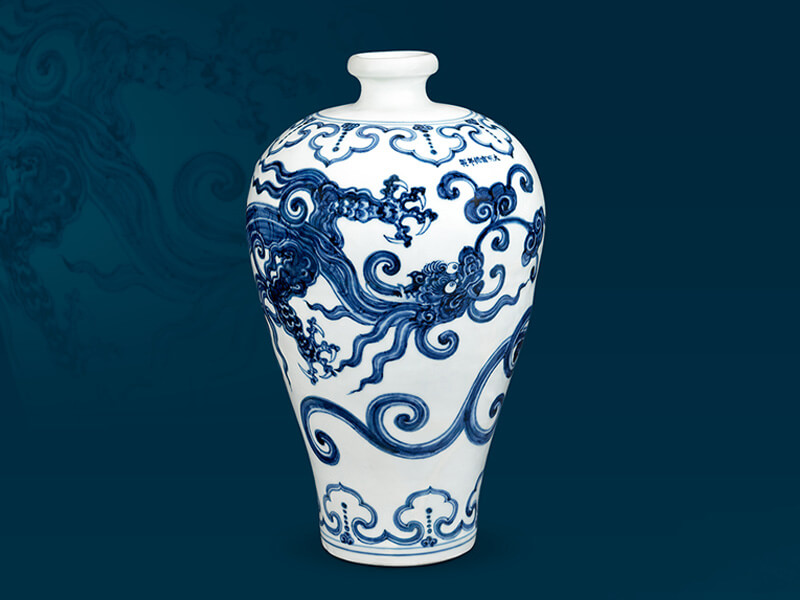 罐口圓整,口沿出脣,頸部短直,腹部圓闊,器底有淺圈足。頸部環列雲紋,腹部繪畫海水波濤雲龍紋,龍紋具有眼鏡眼,翹鼻抿嘴,表情嚴肅,身軀環繞腹部一周,五爪張開如風車,頭頂鬃鬣和肢肘處的關節毛如篦紋般飄揚,是宣德時期典型的龍紋特徵。(高30公分)