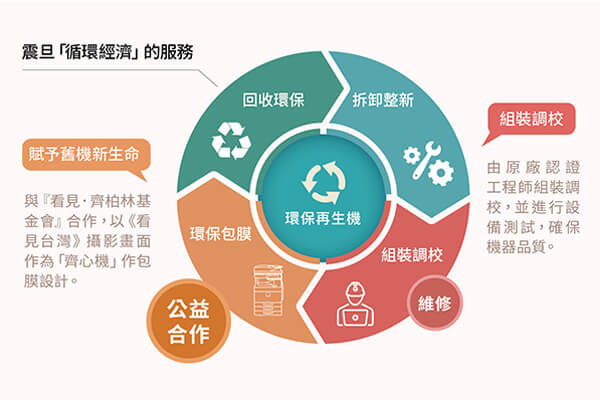 震旦更建立一套完善的「舊機整新流程」回收機制,減少廢棄物造成的資源浪費與汙染,賦予多功能事務機新生命,延續產品的生命週期,用實際行動實踐環保理念。