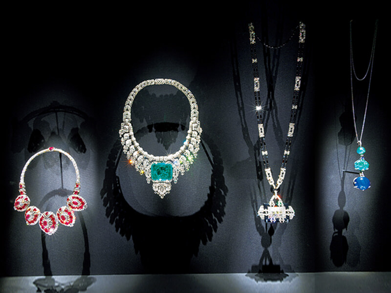 印度納瓦訥格爾大君訂製的紅寶石頸飾。 在樹上歇息的獵豹胸針,展現優雅的姿態。
